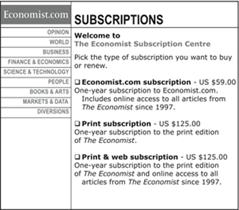 제품 A와 제품 B가 있습니다. 그런 다음 제품 -B(마이너스 B)를 추가합니다. –B가 미끼입니다. –B는 고객이 구매하기를 원하는 좋은 제품(제품 B)과 대비되는 전혀 매력적이지 않은 옵션입니다. 아래 예에서 미끼는 인쇄 구독입니다. 이 옵션을 포함시키면 웹 구독과 인쇄+웹 구독의 구매가 증가합니다.