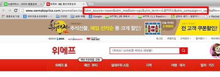 가령 네이버에서 소셜커머스를 검색하고 ‘파워링크’로 위메프에 접속하면 이와 같은 URL이 찍힌다. 네이버에서 들어왔다는 것을 UTM 소스가 표기하며, UTM 미디엄은 클릭 당 과금(CPC) 서비스를 이용했다는 것을 명시하고 있다. 검색어(Term)는 소셜커머스였으며, 어떤 캠페인을 통해 들어왔는지는 위메프 코드를 뜻하는 r_sa로 표기됐다. GA는 이 코드를 자동으로 인식해 네이버 검색 키워드로 유입된 매출을 잡아준다.