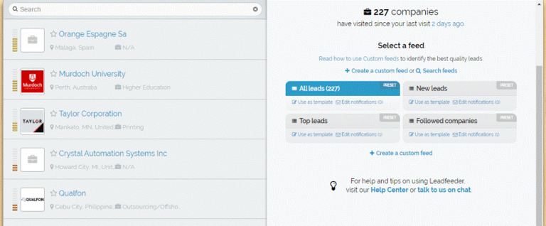 Leadfeeder에 대해 가장 좋아하는 것 중 하나는 사람들이 방문한 페이지, 소요 시간, 위치 및 회사 크기와 같은 정보를 기반으로 결과를 필터링하는 사용자 지정 피드를 만들 수 있다는 것입니다. 이를 통해 올바른 잠재 고객을 타겟팅하여 시간을 최대한 활용할 수 있습니다.