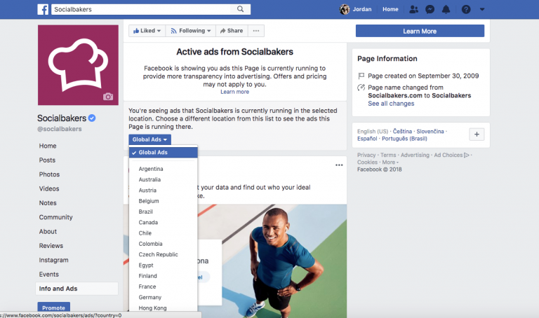 거기서부터, 페이지가 실행중인 모든 광고를 탐색할 수 있습니다. 한걸음 더 나아가 국가별로 필터링하여 각 지역에서 어떤 광고가 게재되고 있는지 확인할 수도 있습니다.