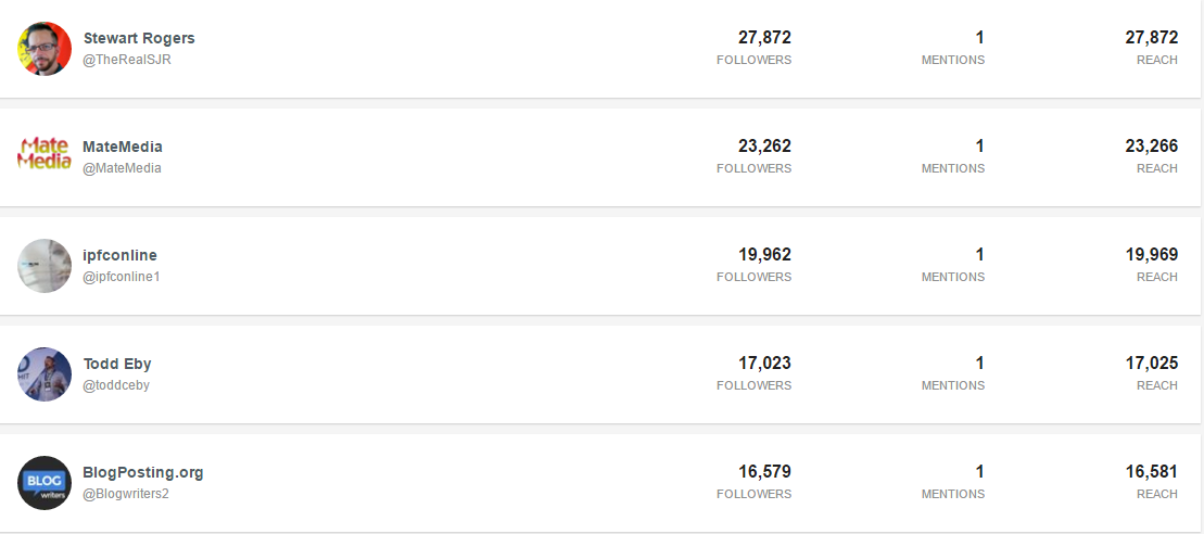 콘텐츠 홍보에 관심있는 인플루언서 및 잠재 고객 / 고객 목록을 작성하십시오. Awario를 사용하여 이러한 영향 요인을 찾을 수 있습니다. 틈새 / 산업 / 게시 주제를 입력하면 해당 주제에 대한 게시물을 공유한 최고의 인플루언서를 표시합니다.