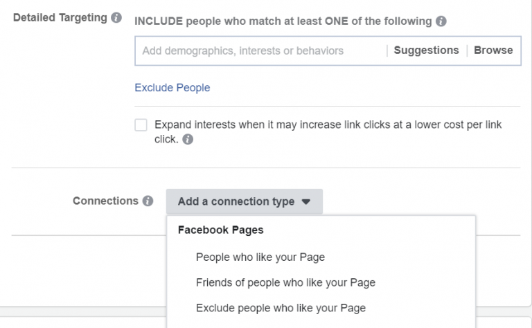 페이스북 페이지 좋아요 타겟팅은 매우 간단합니다. 캠페인의 광고 세트 수준에는 ‘연결’ 섹션이 있습니다:
