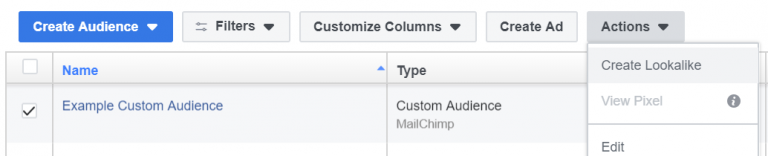 이를 만들려면, 광고 관리자의 ‘잠재 고객’탭으로 돌아가십시오. 그런 다음 맞춤 잠재 고객 옆의 확인란을 선택하고, ‘작업’ 및 ‘유사도 만들기’를 선택하십시오: