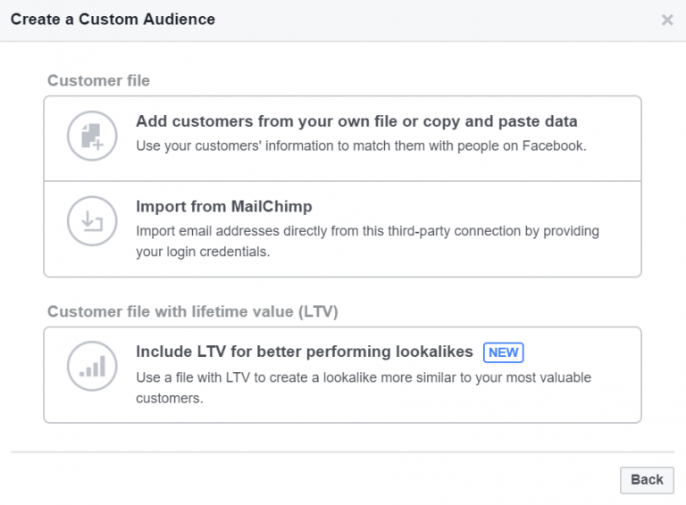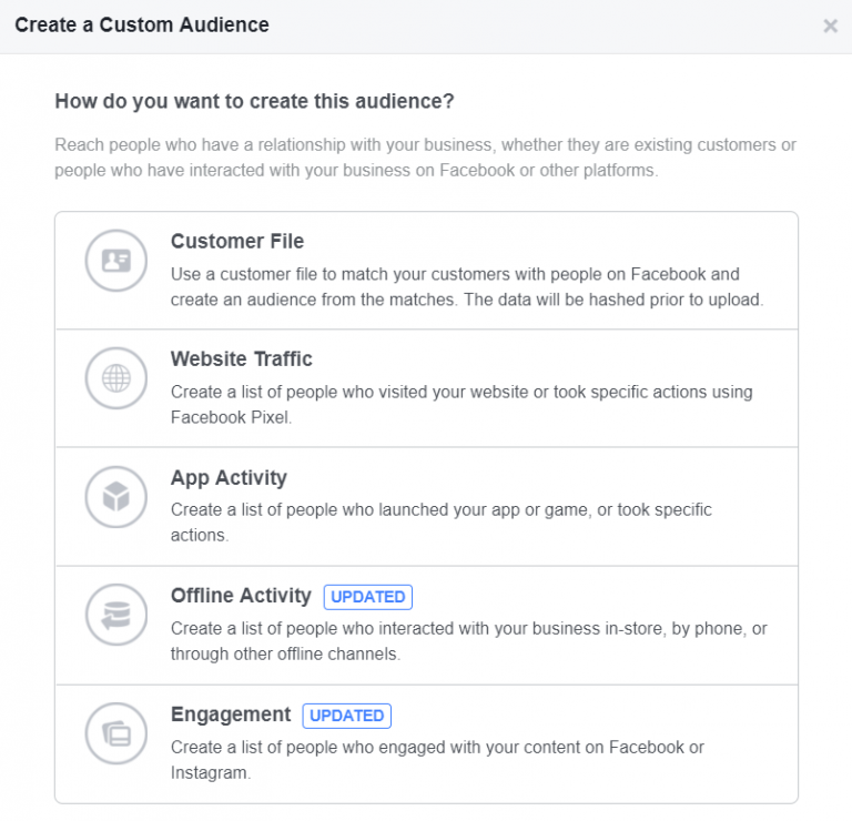 기존 고객을 타겟팅하려면 광고 관리자의 ‘잠재고객’탭으로 돌아가서 ‘만들기’를 선택한 다음, ‘맞춤 잠재고객’을 선택하십시오. 그러면 이 창이 열립니다: