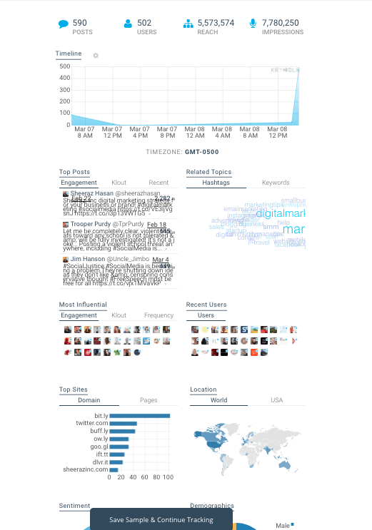 도구는 해시태그 추적에서 아주 괜찮은 도구입니다. 그렇지만, 유감스럽게도 무료 분석 또는 이 시스템에서 “스냅샷”이라고 불리는 것은 여러분의 해시태그를 사용하는 최근 100 개의 트윗에 대한 활동만 파악합니다.