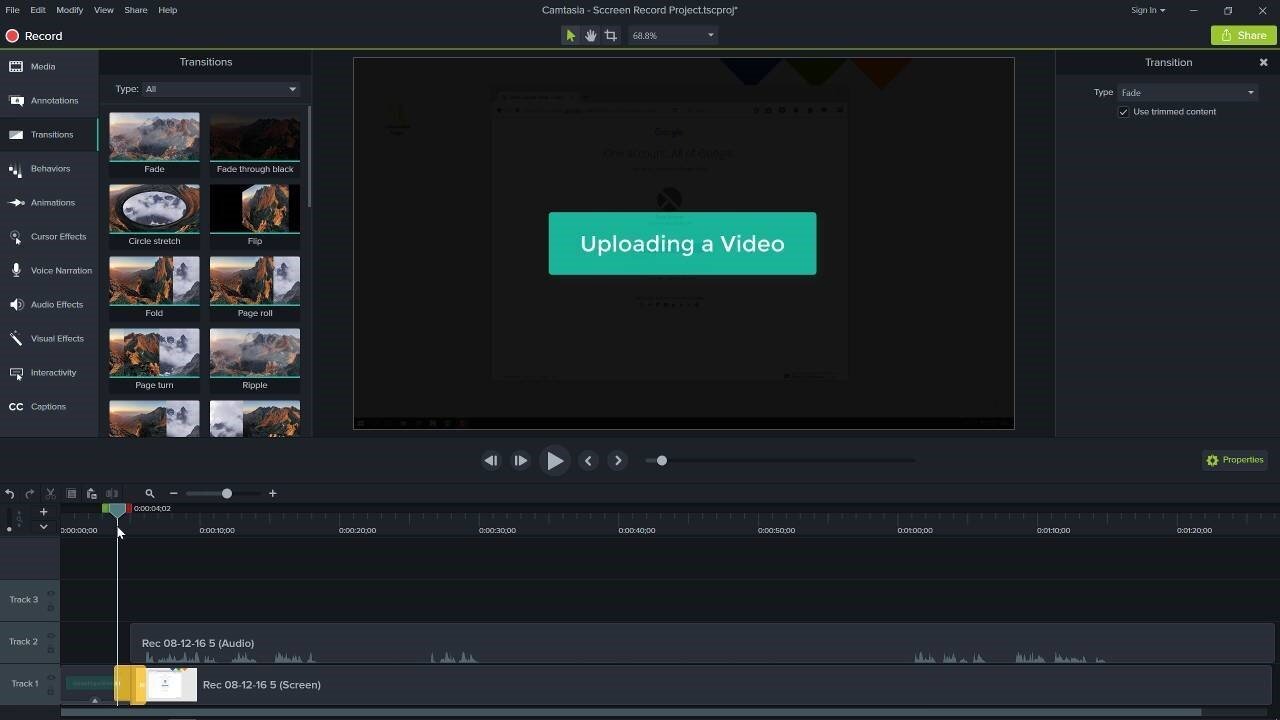 먼저, 비디오 자산에서 라이트웍스(LightWorks), 아이무비(iMovie) 또는 캠타시아(Camtasia, 아래 그림 참조)와 같은 편집 도구를 사용하여 녹화를 일련의 미니 클립으로 줄일 수 있습니다.