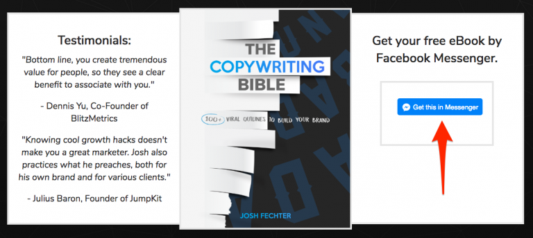 서두, 결론, 그리고 목차를 추가하면, 짜잔, 멋진 리드 자석을 얻었습니다. 준비가 되면, 메시징 옵트인 대신 이북을 제공하여 페이스북 메신저 잠재고객을 구축하는 데 이를 사용할 수도 있습니다. 위의 예는 BAMF의 Josh Fechter가 이 작업을 수행하는 방법을 보여줍니다.