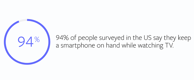 데이터에 따르면, 현재 대다수의 사람들이 스마트폰을 가까이 두고 TV를 시청하고 있으며, 페이스북의 데이터는 페이스북 사용률이 광고 시간에 급격히 증가하는 것을 보여줍니다.