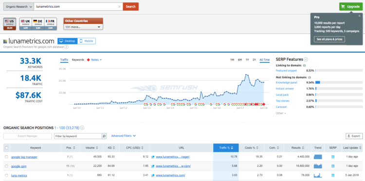 장단점을 이야기해 봅시다. 구글 애널리틱스는 여러분의 고객들이 여러분의 웹 사이트에 어떻게 갔는지 그리고 무엇을 했는지에 대해서 집계하고, 지속적으로 수집된 데이터를 제공합니다. 대부분의 다른 도구는 샘플과 추정치에 의존하며, 사업의 전략적 목표라고 할 수 있는 ‘사이트에서 당신의 오가닉 트래픽이 어떤 성과를 내었는지’에 대한 것은 알려주지 않습니다.