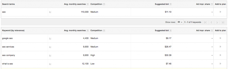 구글 키워드 플래너는 키워드 연구 도구의 ‘최고들 중의 최고(Crème de la Crème)’입니다. 간단히 시드 워드를 입력하면 키워드 제안과 월 평균 검색 예상치가 함께 쏟아지기 시작할 것입니다. 이 도구는 사용자가 제공하는 시드 키워드와 많은 동의어 또는 유사한 검색을 제공합니다.