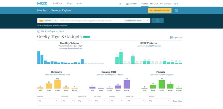 키워드 탐색기는 여러 키워드에 대한 예상 SEO 기회에 대한 인사이트를 제공합니다. 이 도구는 키워드 플래너와 다릅니다. 키워드 우선 순위를 지정하는 데 도움이 되기 때문입니다. 월별 검색 볼륨과 해당 키워드의 경쟁력을 통해 각 키워드의 기회 비용을 계산하는 우선 순위 메트릭을 사용합니다.