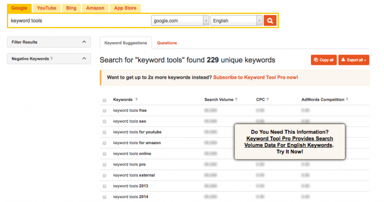 이 프리미엄(Freemium, 기본 서비스는 무료로 제공하고 추가 고급 기능에 대해서는 요금을 받는) 도구는 수많은 키워드 아이디어를 얻기 위해 빠르고 간단하게 사용할 수 있는 것을 원하는 경우에 유용합니다. 이 도구의 독특한 측면은 구글, 유튜브, 빙, 아마존 및 앱스토어 키워드에 이 도구를 활용할 수 있다는 것입니다. Keywordtool.io는 검색량이 낮기 때문에 구글 키워드 플래너에 나타나지 않는 롱테일 키워드에 특히 유용합니다.