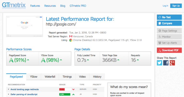 다른 많은 페이지 속도 도구들이 존재하지만, GT메트릭스는 철저함과 사용자 친화성 사이의 균형을 잘 유지하기 때문에 사무실에서 선호되는 도구입니다. 핑돔 (Pingdom)과 구글 페이지 속도 인사이트 (Google PageSpeed Insights) 등 다른 도구도 유용할 수 있습니다.