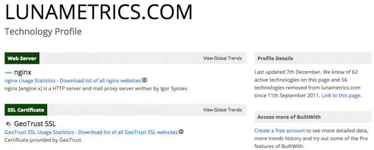 빌트위드는 당신이 예상할 수 있는 일을 합니다. 이는 사이트를 만드는 데 어떤 기술이 사용되었는지 알려주는 웹 사이트 프로파일러 도구입니다. 사이트가 어떤 CMS와 함께 구성되었는지(Builtwith)(이해했죠?), 사이트에 어떤 분석이 구현되었는지 등을 확인할 수 있습니다! SEO 클라이언트 작업을 하고 있는 분들을 위한 훌륭한 도구입니다. 또한 빠른 검사를 선호하는 사용자를 위한 크롬 확장 프로그램도 있습니다.