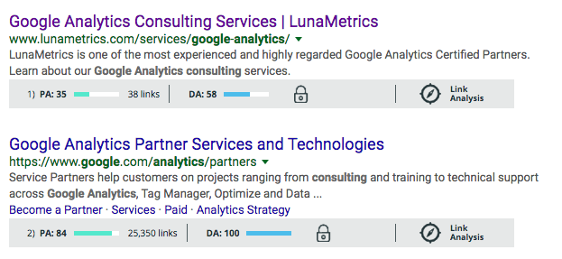 인덱싱 문제가 있는지 확인하는 가장 빠른 방법은 구글 또는 빙의 검색 기능을 사용하는 것입니다. “site:lunametrics.com seo tools”를 검색하여, 결과의 첫번째 페이지는 아니더라도, 도메인이 SEO 도구를 위해 색인화 되어 있는지 빨리 확인할 수 있습니다.