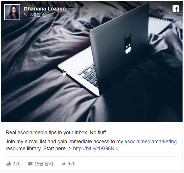아래의 예는 팔로워들에게 리스트 가입을 요청하고 콘텐츠 입니다. 트위터에서는 트위터 카드를 이용한 반면, 페이스북에서는 이미지와 링크를 캡션에 사용했고 문구를 약간 수정했습니다.