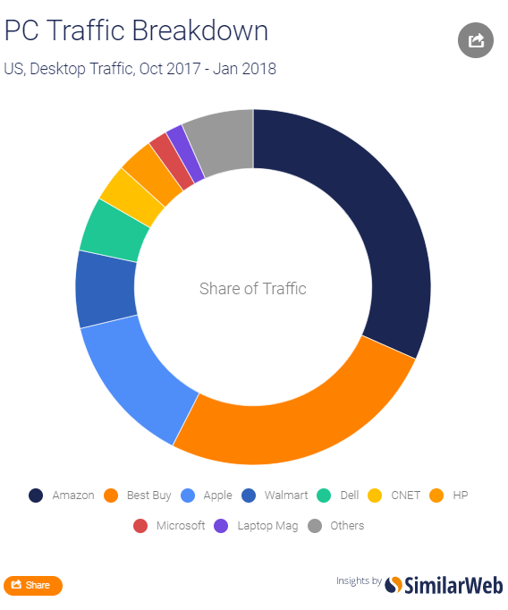 2017년 10월부터 2018년 1월까지 미국에서 컴퓨터, 노트북 및 태블릿 관련 사이트 그룹으로 유입 된 트래픽은 월 평균 44.1M의 데스크톱 방문을 기록했습니다. 이 트래픽 중 65 %는 Amazon, Best Buy 및 Walmart와 같은 멀티 브랜드 온라인 소매 업체를 방문했습니다. 추가로 26%가 Apple, Dell 및 HP와 같은 자체 브랜드 사이트를 방문했습니다. 나머지 9%는 CNET, Laptop Mag 등과 같은 콘텐츠 및 리뷰 사이트에 방문했습니다.