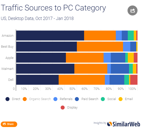 브랜드의 상당 부분인 자연 검색(Organic Search)은 상위 5개 사이트 각각에 대한 주요 트래픽 발생기이기도 합니다. 브랜드 사이트인 apple.com과 dell.com은 유료 검색 광고와 디스플레이 광고의 조합에 더 많은 투자를 하고 있어 amazon.com 및 bestbuy.com에서 그들의 제품을 판매하고 파트너십을 맺고 있음도 불구하고 보다 일반적인 소매 업체와도 경쟁해야 합니다. walmart.com의 유료 검색에 대한 막대한 지출은 아마존 등의 사이트에 대한 소비자 전자 제품 트래픽을 몰아 내겠다는 결심을 나타냅니다.