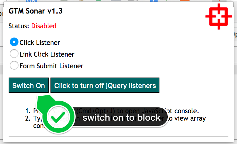 GTM이 이벤트를 추적하고 있는지 확인하려면 제품에 대한 클릭 및 탈출을 수행하거나 GTM sonar Chrome 확장 프로그램을 사용하여 클릭의 기본 동작을 차단할 수 있습니다 (이 글의 디버깅 섹션에서 작동하는 방식을 설명합니다).
