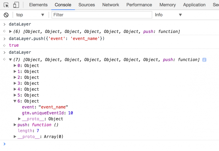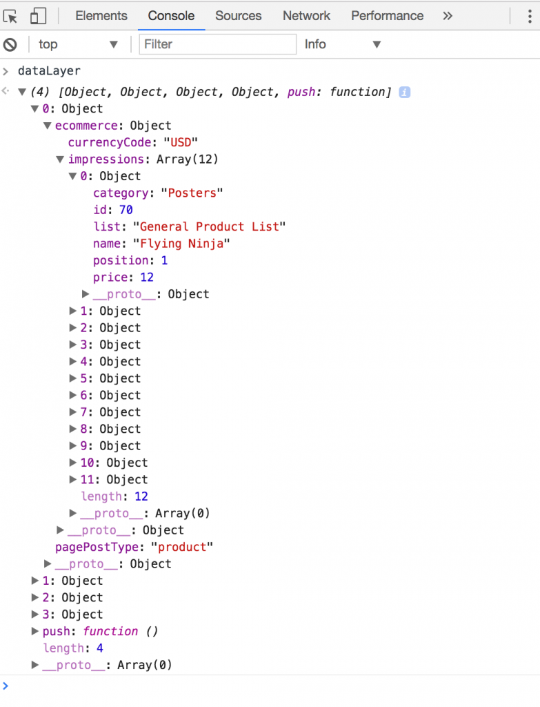 - dataLayer 변수 콘솔에 입력 ; 결과에 아래 그림과 유사한 내용이 표시되면 dataLayer가 올바르게 채워집니다 (데이터가 구글 애널리틱스가 아니라 태그 관리자로 전달됨).