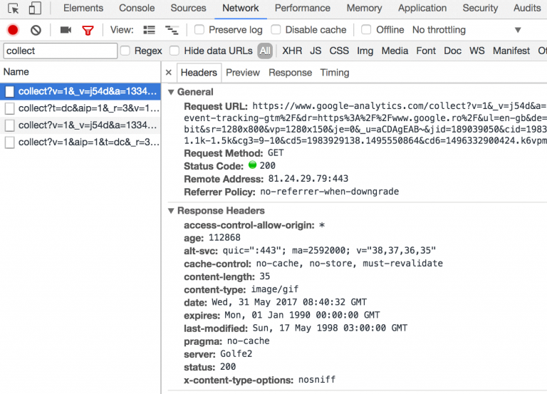 - 네트워크 탭 : 구글 애널리틱스 요청 수집 (GA로 데이터를 전송하는 데 사용됨)