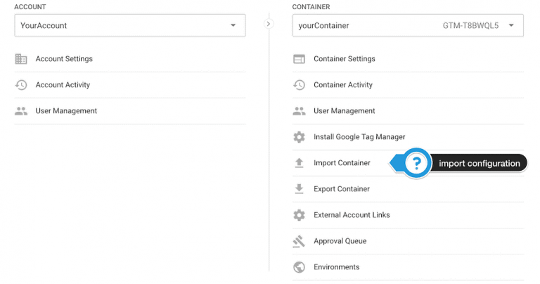 컨테이너 설정 메뉴에서 가져 오기를 누르기만하면 태그 관리자 컨테이너로 가져올 수 있습니다.