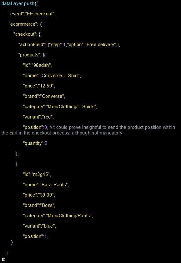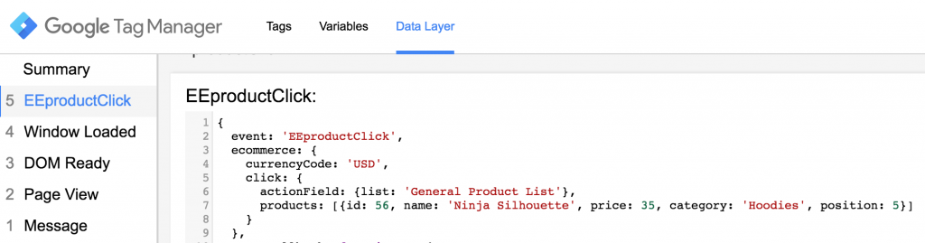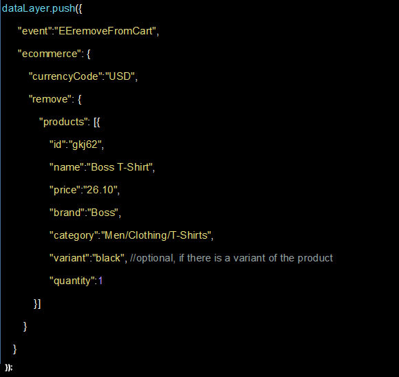 아래는 dataLayer 푸시에 대한 코드 샘플입니다. 제품 클릭 이벤트와 조금 비슷합니다.