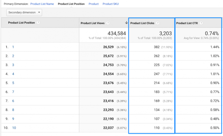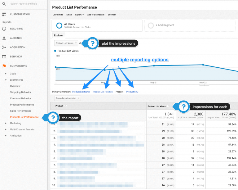 구글 애널리틱스에서 실적를 확인하려면 전환> 전자 상거래> 제품 목록 실적 보고서를 확인하세요