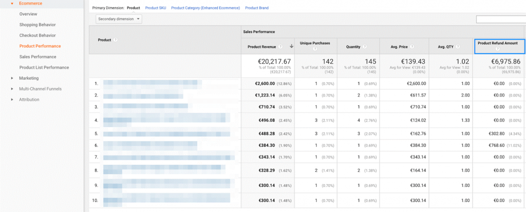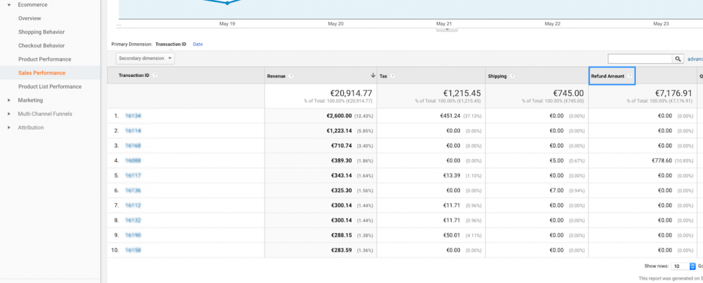 애널리틱스에서는 전자 상거래>판매 실적 보고서에서 각 거래에 대해 환불 된 금액을 확인할 수 있습니다.