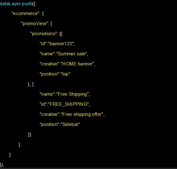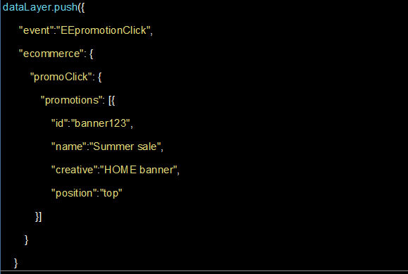 이는 모든 페이지에서 발생할 수 있습니다. 따라서 배너 / 프로모션의 실적을 확인하려면 데이터가 표시되는 페이지에서 데이터를 dataLayer로 푸시해야 합니다.