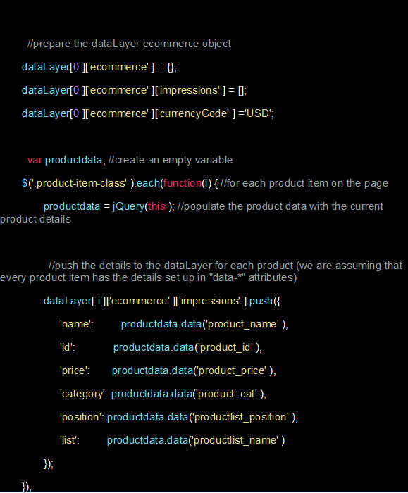 하나 이상의 “data- *”속성을 사용하여 웹 페이지 코드의 어딘가에서 각 제품의 전자 상거래 객체에 대한 데이터를 제공해야 합니다. 그런 다음 전자 상거래 데이터를 GTM 변수로 캡처해야 합니다.