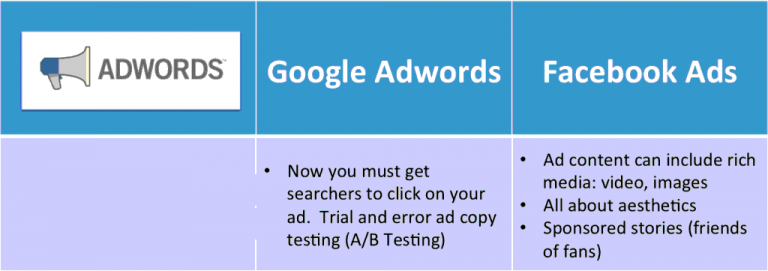 이 표에서 볼 수 있듯이, 페이스북은 사용자의 선호도에 기초한 광고를 보여주는 경향이 있는 반면, 애드워즈 검색광고는 키워드에 초점을 맞추고 있습니다. 사용자에 대한 인구 통계학적 자료가 대개 더 완전하기 때문에 페이스북에서 타겟팅하는 것이 더 쉽고 정확한 타겟팅이 가능합니다.