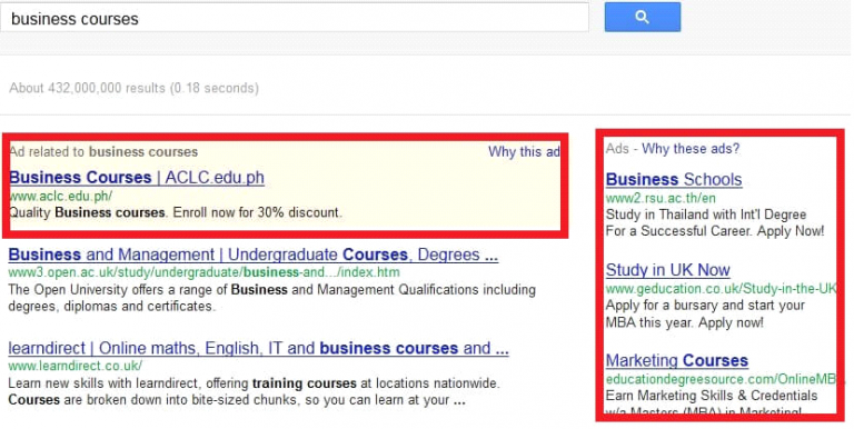 반면 구글 애드워즈 검색광고는 사용자 선호도에 기초한 광고를 시작할 수 있습니다. 하지만 구글은 페이스북처럼 사람들이 하는 행동에 대해서는 알지 못합니다. 사용자의 ‘좋아요’ 혹은 팔로우를 확인할 수 없고, 개인 프로필 데이터도 볼 수 없습니다. 관련 광고는 주로 검색 조건에 의해 나타납니다. 그래서 구글에 “business courses”와 같은 용어를 검색했을 때, 당신이 business courses와 관련된 광고를 볼 수 있는 것입니다.