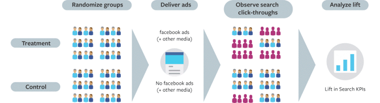 이를 테스트하기 위해 페이스북은 자동차, CPG, 엔터테인먼트, 기술 및 소매 등 다양한 부문에서 200개 이상의 광고 캠페인에 대한 분석을 실시했습니다. 페이스북 연구원들은 사용자들을 두 그룹으로 분류하기 위해 결과를 나누었습니다. 검색을 통해 웹사이트를 들어왔고 페이스북 광고 또한 본 그룹과, 페이스북 광고를 보지 않고 검색을 통해 들어온 그룹으로 말입니다.