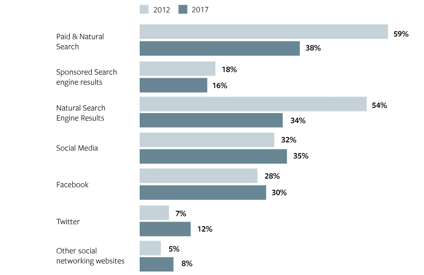 포레스터(Forrester)의 최신 보고서에 따르면 소셜 미디어 플랫폼은 지난 5년간 검색 사용이 크게 증가한 반면 검색 엔진 사용은 같은 기간 동안 감소했다고 합니다.