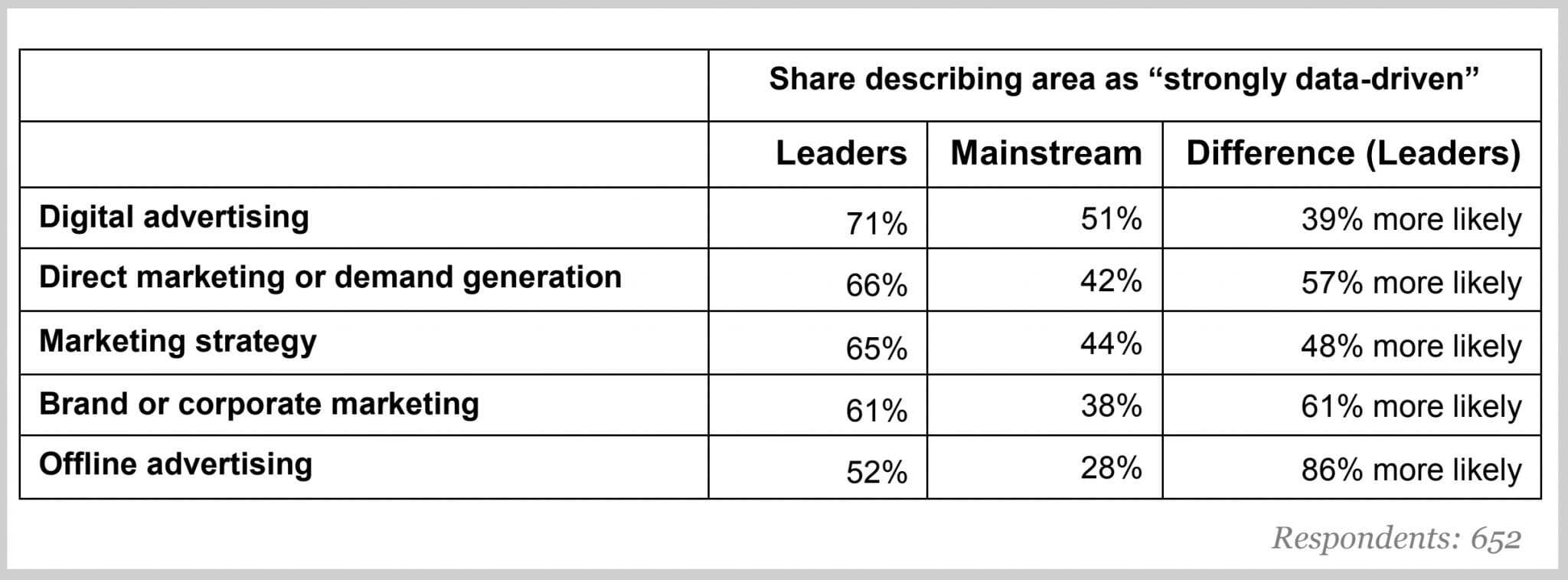 - 리더는 문서화 된 데이터 및 분석 전략을 가지고 있을 가능성이 35 % 더 높습니다 (66 % vs. 49 %).