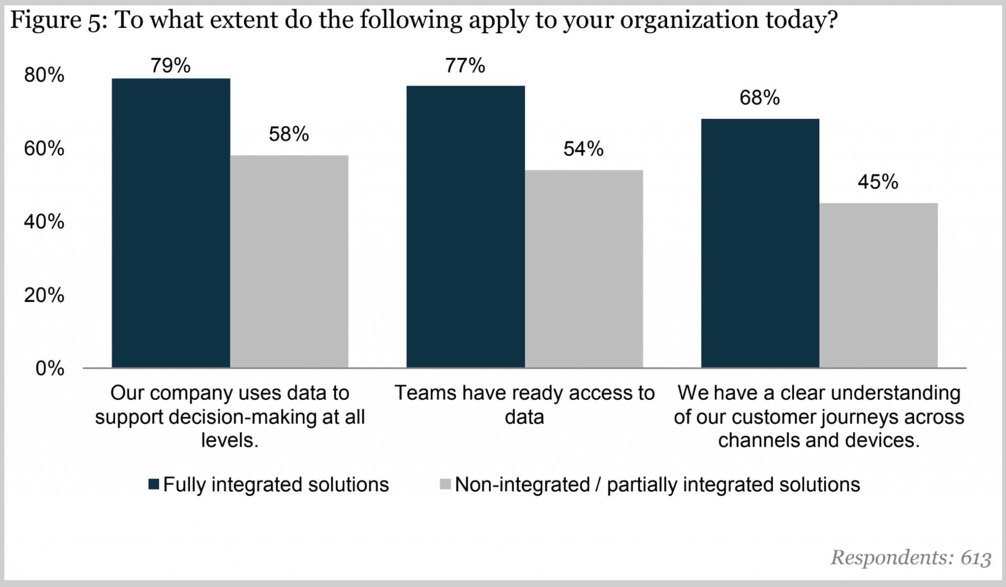 - 완벽하게 통합된 솔루션을 갖춘 회사는 데이터 관련 목표를 달성하는 데 필요한 분석 리소스를 보유 할 확률이 43 % 높습니다.