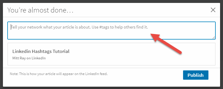 아티클 설명에 세 개의 태그를 추가할 수 있습니다. ‘게시’를 클릭하면 해시태그를 포함할 수 있는 링크드인 아티클 설명에 태그를 추가하라는 팝업이 나타납니다.