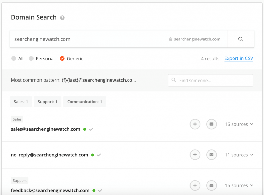 링크 구축 의도가 많은 아웃 리치 이메일의 경우 소싱이 더 어려워집니다. 업계 전문가 및 영향력 있는 사람을 타겟팅하기로 결정했다면 Email Hunter 및 Voila Norbert와 같은 도구가 해결책이 될 수 있습니다. 이러한 서비스는 연락할 적절한 사람을 찾는 경우에 활성 웹 사이트의 관련 이메일 주소를 인터넷을 통해 검색하여 정확히 명중하도록 도와줍니다.