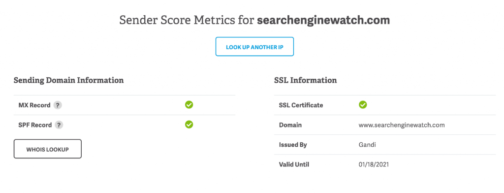 발신자 점수는 이전 상호 작용에 의해 계산되며, 일반적으로 여러분이 보낸 이메일을 몇 명의 사용자가 여는지에 따라 계산됩니다. 현재 이메일 주소가 대부분의 서버의 필터를 통과하는지 확인할 수 있는 훌륭한 웹 사이트는 Senderscore.org입니다. Senderscore.org와 상의하면 이메일이 전송되는 방식과 이메일이 수신자의 받은 편지함으로 보내지는지의 여부를 알려줍니다.