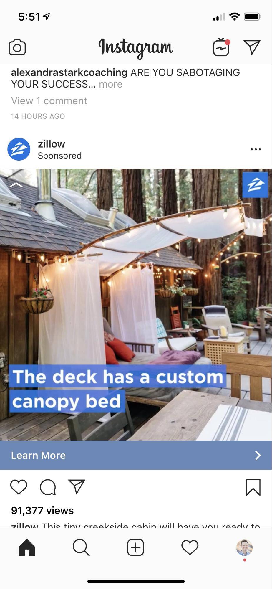 아래 예에서 Zillow가 고품질 사진을 사용한 것을 볼 수 있습니다. 광고에는 시각적으로 매력적인 경험을 만들기 위해 애니메이션 텍스트가 포함된 이미지 슬라이드 쇼가 포함되었습니다.