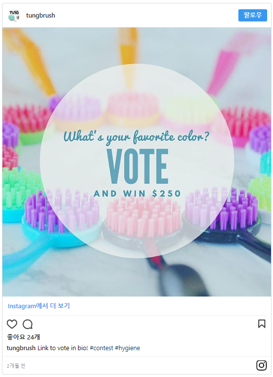 - TUNG Brush: 이 혀전용 칫솔(혀클리너) 업계의 선두 주자는 최근에 인플루언서들과 협력하여 그들이 어떤 색의 칫솔을 새로 출시해야 하는지 사업적인 결정을 내리는 것에 도움을 받고 있습니다. 이들은 인플루언서들에게 모든 칫솔 색상을 보여주는 창의적인 인스타그램 사진을 게시하도록 요구했고, 인플루언서들은 그들의 구독자에게 가장 좋아하는 색에 투표하고 $250 기프트 카드를 얻을 수 있는 랜딩 페이지를 보냈습니다.