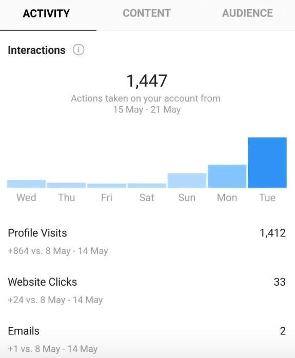 인스타그램 프로필 분석은 인스타그램 프로필과 관련된 메트릭스를 가리킵니다. Insights 버튼을 클릭하면 세 가지 주요 유형의 메트릭스 – 활동, 콘텐츠 및 청중을 볼 수 있습니다.