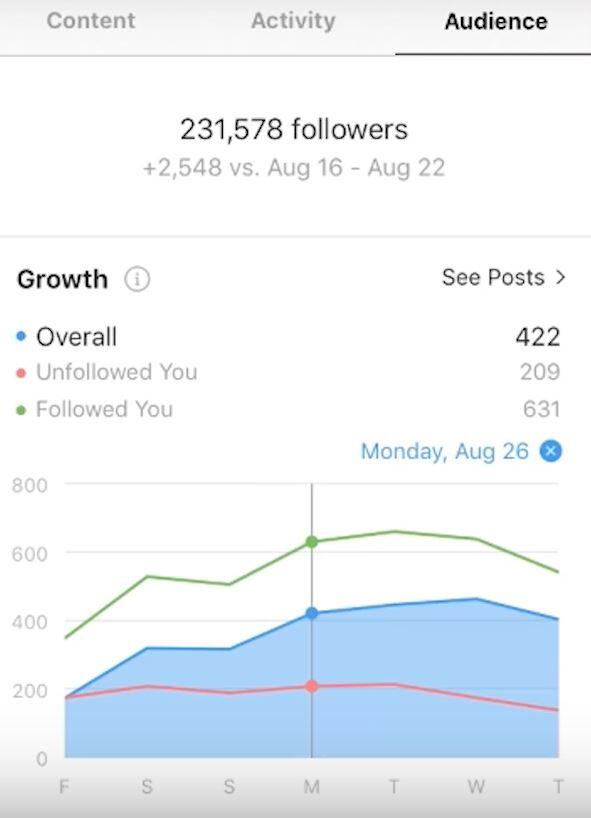 인스타그램 인스이트의 청중 섹션에는 당신의 계정에 있는 정확한 팔로워 수 목록이 있습니다. 이를 통해 지난 주부터 얻은 팔로워의 양을 알 수 있습니다. 이것은 당신을 팔로우하거나 팔로우를 취소한 사람들의 수에 근거한 것입니다.