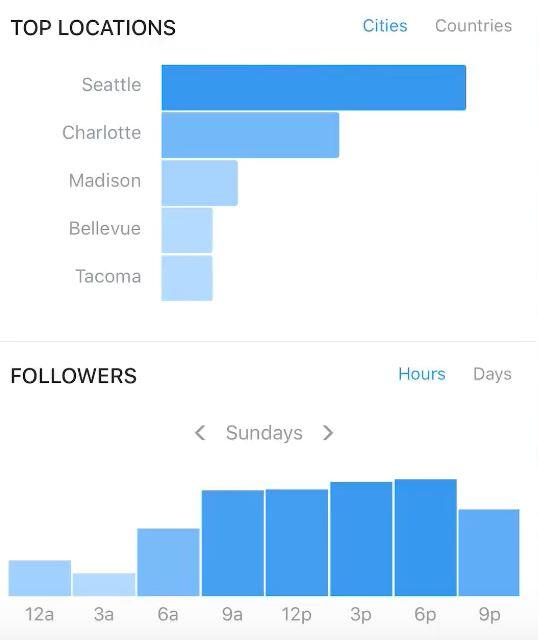 아래 예에서 계정 청중의 대다수는 시애틀 출신입니다. 그들은 보통 25세에서 34세 사이의 밀레니얼 세대이고, 18세에서 24세 사이의 청소년들이 그 뒤를 잇습니다.
