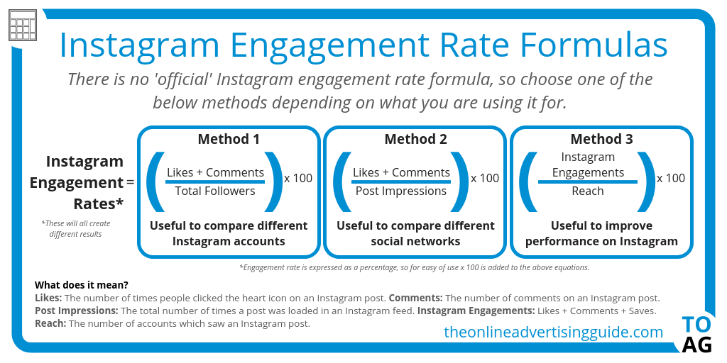 인스타그램 참여를 계산하는 정확한 방법은 없습니다. 따라서, 온라인 광고 가이드는 다양한 인스타그램 계정과 소셜 네트워크에 걸친 참여를 비교하기 위해 몇 가지 공식을 작성했습니다.