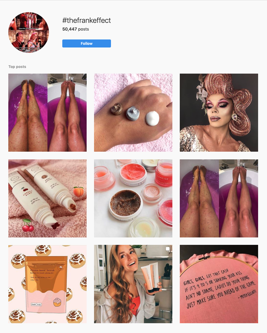 예를 들어 호주 화장품 브랜인 Frank Body는 소셜 미디어 채널만 사용하여 브랜드를 출시하고 성장 시켰으며 소셜 미디어 전략은 UGC에 중점을 두었습니다. 고객은 해시 태그 #letsbefrank 및 #thefrankeffect를 사용하여 브랜드의 시그니처 제품인 커피 스크럽을 얼굴과 몸에 행복하게 바른 100,000개가 넘는 이미지를 업로드했습니다. 그리고 이러한 고객 공유 전략을 통해서 회사는 2 천만 달러가 넘는 수입을 올렸습니다.