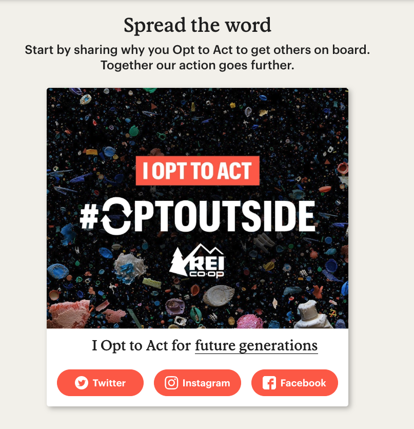 • 브랜드 제품 / 서비스와 관련하여 소셜 미디어 도전 과제를 만듭니다 (예 : 사람들이 야외 활동을 한 후 이미지를 공유하도록 장려하는 REI의 #optoutside 캠페인)