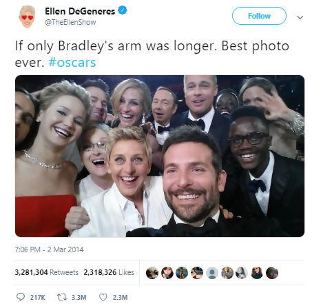 Ellen DeGeneres가 오스카 시상식을 주최했던 때를 기억하세요? 그녀 덕분에 그날 밤은 따뜻한 유머와 피자를 먹는 연예인들로 가득했습니다. 하지만 가장 큰 히트는 Julia Roberts, Bradley Cooper, Brad Pitt, Angelina Jolie 그리고 수많은 다른 배우들과 함께한 그녀의 셀카였습니다. 그녀는 트위터에 셀카를 올렸고, 셀카는 몇 시간 만에 엄청나게 퍼졌습니다. 이 말도 안 되는 좋아요 수와 리트윗 수를 좀 보세요:.