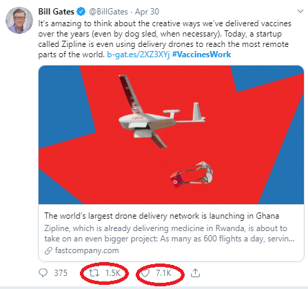 하지만, 바이럴 마케팅의 관점에서, 화제가 되는 이슈를 다루는 것은 트위터에서 유명해지는 가장 효율적인 방법입니다. 예를 들어, 만약 여러분이 해시태그 #vaccineswork를 검색한다면, 검색 결과의 맨 위에 나타나는 바이럴 트윗은 UNICEF나 WHO의 것이 아니라, 예방접종을 지원하는 것에 대한 강한 입장을 표명한 Bill Gates의 트윗입니다.